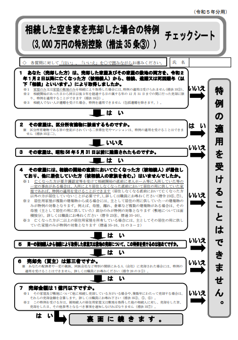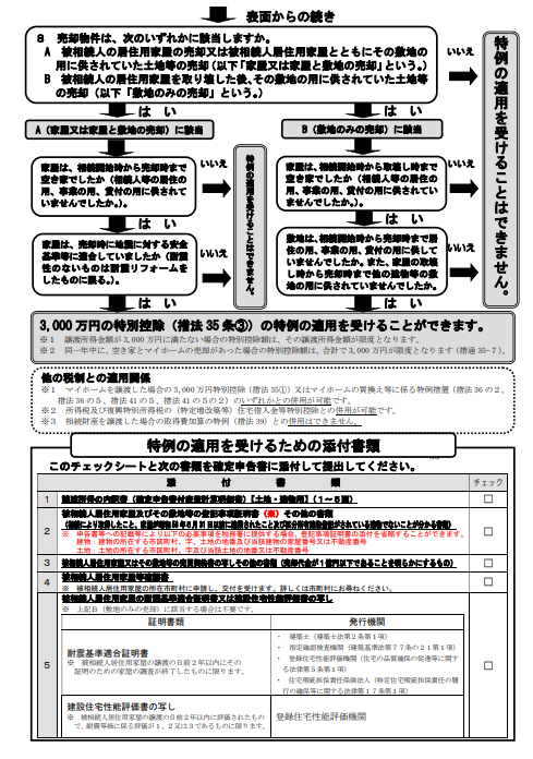 下記画像は、国税庁ホームページでアップしている相続した空き家を売却した場合の特例(3,000万円の特別控除(措法35条③))チェックシートです。